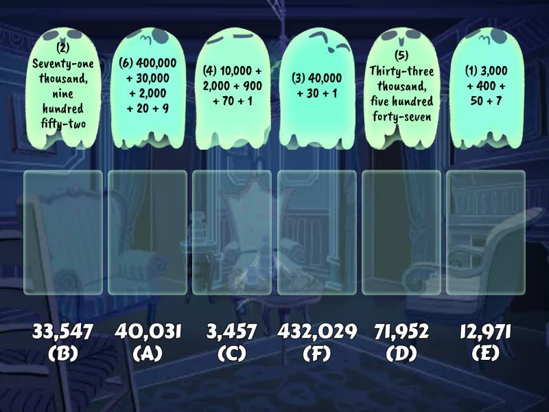 (1) 3,000 + 400 + 50 + 7 - 3,457 (C), (2) Seventy-one thousand, nine hundred fifty-two - 71,952 (D), (3) 40,000 + 30 + 1 - 40,031 (A), (4) 10,000 + 2,000 + 900 + 70 + 1 - 12,971 (E), (5) Thirty-three thousand, five hundred forty-seven  - 33,547 (B), (6) 400,000 + 30,000 + 2,000 + 20 + 9 - 432,029 (F),