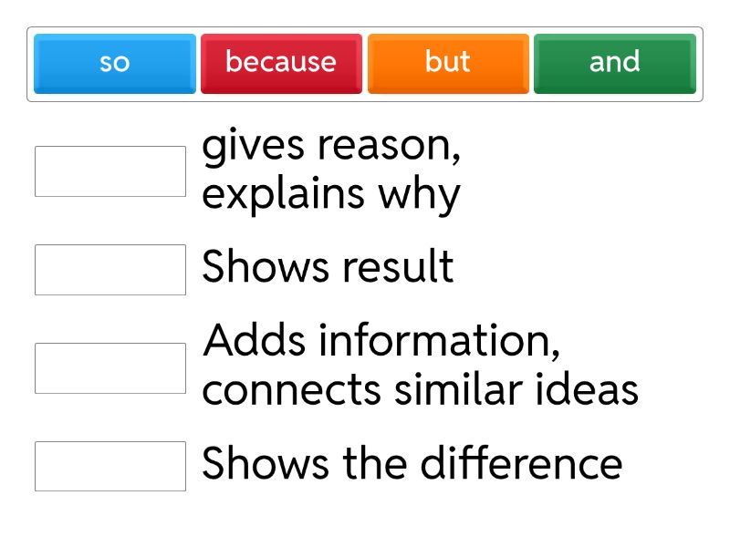 and - Adds information, connects similar ideas, but - Shows the difference, because - gives reason, explains why , so - Shows result,