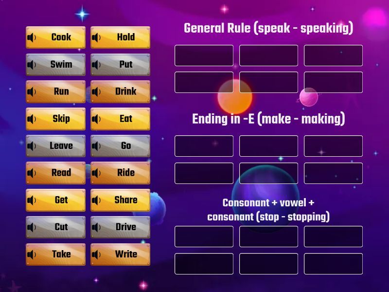 General Rule (speak - speaking): Eat, Go, Read, Cook, Drink, Hold, Ending in -E (make - making): Drive , Ride, Write, Share, Take, Leave, Consonant + vowel + consonant (stop - stopping): Skip, Swim, Cut, Run, Get, Put,