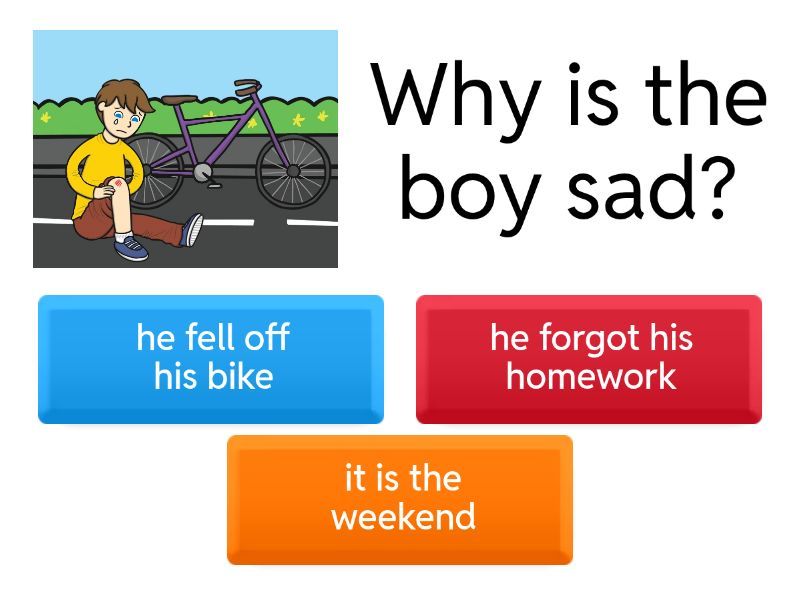 1) Why is the boy sad? a) he fell off his bike b) he forgot his homework c) it is the weekend 2) Why is the boy happy? a) it is the weekend b) it is his birthday c) he finished his homework 3) Why is she using an umbrella? a) it is cold b) it is raining c) it is sunny 4) Why is the girl happy? a) she scored a goal b) it is her birthday c) she got an award 5) Why is the girl scared? a) she is getting a needle b) she is scared of the storm c) she is scared of spiders 6) Why are they wearing coats? a) they like them b) it is cold c) it is morning 7) Why is the boy scared? a) he is scared of dogs b) he is scared of the storm c) he is scared of spiders 8) Why is the boy happy? a) he likes butterflies b) it is raining c) he doesn't like being in the yard 9) Why is the boy wearing a hat? a) it is cold b) he is on holidays c) it is sunny 10) Why is the girl laughing? a) her story is funny b) it is the weekend c) it is bedtime 11) Why is the boy scared? a) he is in the backyard b) he is scared of wasps c) he is late for school 12) Why is the boy happy? a) it is the weekend b) he likes ice cream c) he likes stories