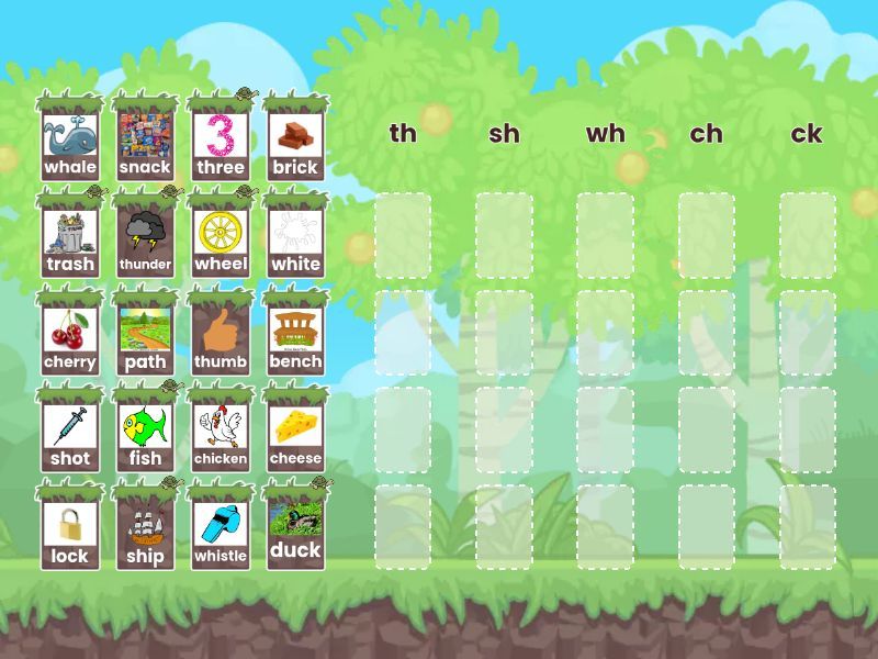 th: thumb, three, path, thunder, sh: ship, trash, shot, fish, wh: whale, whistle, wheel, white, ch: chicken, cherry, cheese, bench, ck: duck, snack, lock, brick,