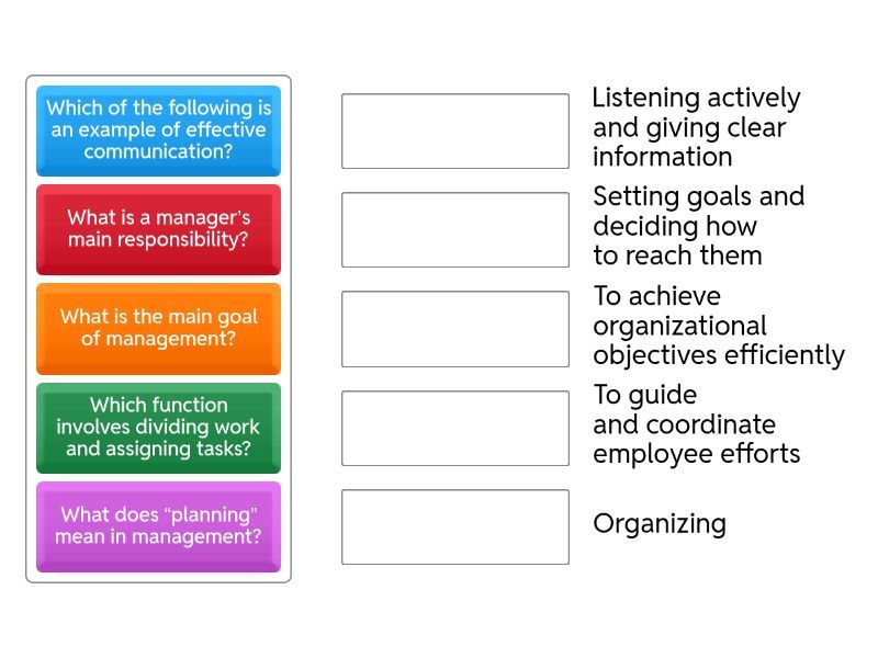 What is the main goal of management? - Organizing, Which of the following is an example of effective communication? - To guide and coordinate employee efforts, Which function involves dividing work and assigning tasks? - Setting goals and deciding how to reach them, What is a manager’s main responsibility? - Listening actively and giving clear information, What does “planning” mean in management? - To achieve organizational objectives efficiently,