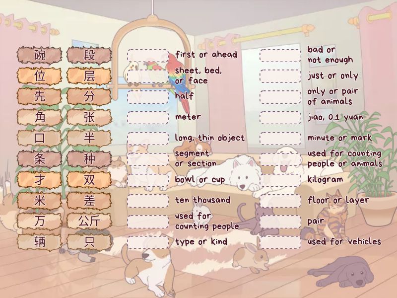 位 - used for counting people, 口 - used for counting people or animals, 层 - floor or layer, 段 - segment or section, 公斤 - kilogram, 角 - jiao, 0.1 yuan, 辆 - used for vehicles, 米 - meter, 双 - pair, 条 - long, thin object, 种 - type or kind, 碗 - bowl or cup, 分 - minute or mark, 张 - sheet, bed, or face, 半 - half, 万 - ten thousand, 先 - first or ahead, 只 - only or pair of animals, 才 - just or only, 差 - bad or not enough,