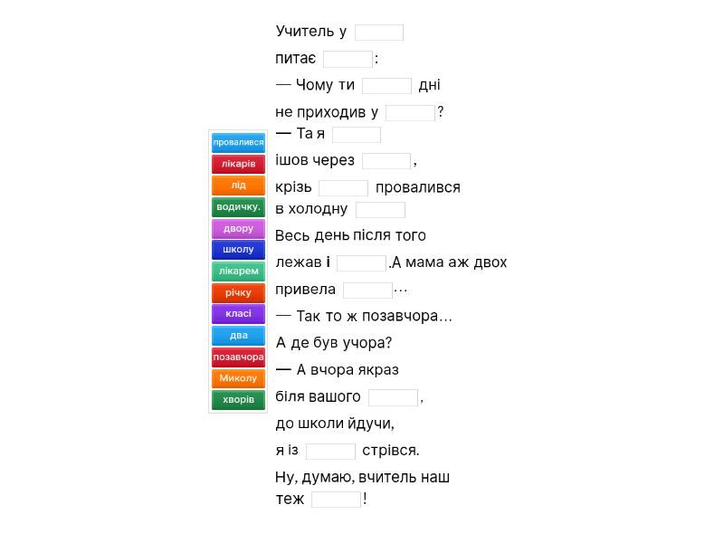 Учитель у ____ питає ____: — Чому ти ____ дні не приходив у ____? — Та я ____ ішов через ____, крізь ____ провалився в холодну ____ Весь день після того лежав і ____.А мама аж двох привела ____… — Так то ж позавчора… А де був учора? — А вчора якраз біля вашого ____, до школи йдучи, я із ____ стрівся. Ну, думаю, вчитель наш теж ____!