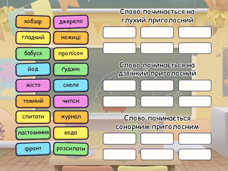 Слово починається на глухий приголосний: спитати, фронт, кобзар, скеля, темний, пролісок, Слово починається на дзвінкий приголосний: джерело, бабуся, гладкий, ґудзик, журнал, чипси, Слово починається сонорним приголосним: розсипати, йод, вода, місто, ластовиння, ножиці,