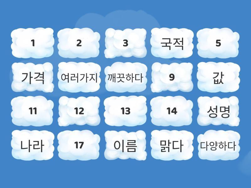 이름 - 성명, 국적 - 나라, 값 - 가격, 깨끗하다 - 맑다, 여러가지 - 다양하다, 3일 - 사흘, 1일 - 하루, 2일 - 이틀, 한 달 - 일 개월, 호텔 - 숙소,