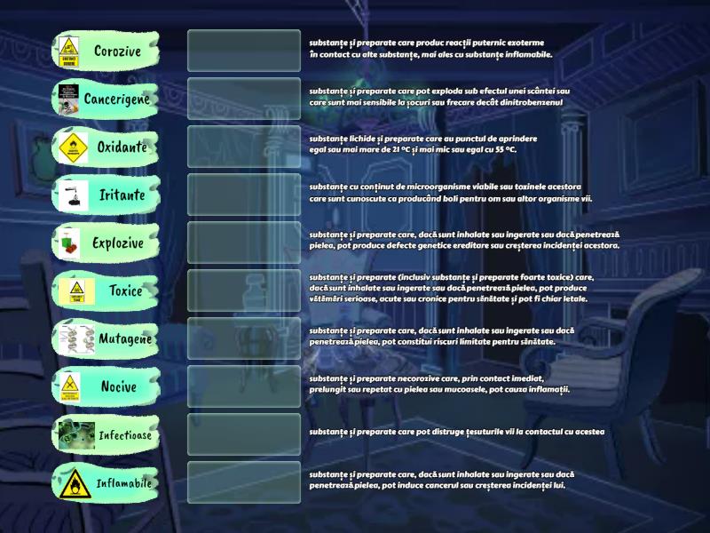Toxice - substanțe și preparate (inclusiv substanțe și preparate foarte toxice) care, dacă sunt inhalate sau ingerate sau dacă penetrează pielea, pot produce vătămări serioase, acute sau cronice pentru sănătate și pot fi chiar letale., Corozive - substanțe și preparate care pot distruge țesuturile vii la contactul cu acestea, Cancerigene - substanțe și preparate care, dacă sunt inhalate sau ingerate sau dacă penetrează pielea, pot induce cancerul sau creșterea incidenței lui., Mutagene - substanțe și preparate care, dacă sunt inhalate sau ingerate sau dacă penetrează pielea, pot produce defecte genetice ereditare sau creșterea incidenței acestora., Infectioase - substanțe cu conținut de microorganisme viabile sau toxinele acestora care sunt cunoscute ca producând boli pentru om sau altor organisme vii., Explozive - substanțe și preparate care pot exploda sub efectul unei scântei sau care sunt mai sensibile la șocuri sau frecare decât dinitrobenzenul, Inflamabile - substanțe lichide și preparate care au punctul de aprindere egal sau mai mare de 21 °C și mai mic sau egal cu 55 °C., Oxidante - substanțe și preparate care produc reacții puternic exoterme în contact cu alte substanțe, mai ales cu substanțe inflamabile., Iritante - substanțe și preparate necorozive care, prin contact imediat, prelungit sau repetat cu pielea sau mucoasele, pot cauza inflamații., Nocive - substanțe și preparate care, dacă sunt inhalate sau ingerate sau dacă penetrează pielea, pot constitui riscuri limitate pentru sănătate.,