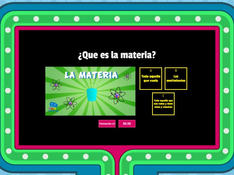 1) ¿Que es la materia? a) Todo aquello que vuela b) Los sentimientos c) Todo aquello que nos rodea y tiene masa y volumen 2) ¿ Que son la masa y el volumen? a) Propiedades generales de la materia b) Herramientas c) Alimentos 3) ¿ Que es la masa? a) La masa de las magdalenas b) La cantidad de aire c) La cantidada de materia que tiene un cuerpo 4) ¿Que es el volumen? a) El espacio que ocupa un objeto b) Lo alto que es un objeto c) Lo alto que habla un cuerpo 5) ¿ Que pesa mas un puñado de plastilina un puñado de hierro? a) Hierro b) Los dos igual c) Plastilina 6) ¿ Que es la dureza? a) Cuando algo soporta peso y no se rompe b) Cuando algo es gordo c) Cuando algo es fino 7) ¿ Que es la fragilidad? a) Cuando algo se rompe fácil b) Algo suave c) Algo rugoso 8) ¿ Que es la elasticidad? a) La materia es elastica si se puede estirar b) Si es duro c) Si no es duro 9) ¿ Que es más frágil: la plastilina o el cristal? a) Plastilina b) Cristal c) Los dos iguales 10) ¿ Que es un material que se rompe fácil? a) Frágil b) Fuerte c) Ancho 11) ¿Cómo se llama el material que deja pasar la luz? a) Pequeño b) Transparente c) Ópaco 12) Para saber si un material es liso o rugoso hablamos de... a) Textura b) Conductividad 13) ¿Cómo puede estar la materia? a) Sólido, Líquido y Estrujado b) Sólido, Líquido y Gaseoso c) Flotando