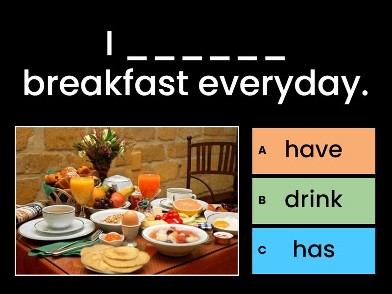 1) I ______ breakfast everyday. a) have b) drink c) has 2) You ______ to Rome once a month. a) have b) go c) want 3) ______ she _____ well? a) Does / sings b) Does / sing c) Do / sings 4) They _________ Mexican food. a) don't ask b) don't drink c) don't like 5) You _______ a lot of salad for lunch. a) take b) eat c) go 6) We _______ alcohol before we drive. a) don't eat b) don't drink c) have 7) ______ you _________ dinner at home? a) Does / eat b) Do / has c) Do / have 8) Where _____ you _______? a) do / live b) do / lives c) do / have 9) How ______ he _______ to work? a) do / go b) does / go c) do / goes 10) He ____ three dogs a) haves b) has c) have