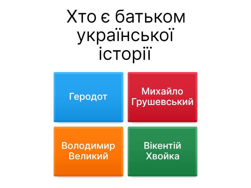 1) Хто є батьком української історії a) Геродот b) Михайло Грушевський c) Володимир Великий d) Вікентій Хвойка 2) Утворення Галицько-Волинського князівства a) 1205 р. b) 1199 р. c) 882 р. d) 1240 р. 3) Хто запровадив християнство на Русі a) Ярослав Мудрий; b) Княгиня Ольга c) Володимир Великий d) Святослав Хоробрий 4) Вкажіть дату дня Злуки ЗУНР та УНР. a) 21 січня 1990 р. b) 24 серпня 1991 р. c) 22 січня 1919 р. d) 28 червня 1996 р 5) Яка кількість універсалів видала УЦР a) 4; b) 3; c) 2; d) 5. 6) Коли відбувся бій під Крутами. a) 18 січня 1919 р. b) 21 січня 1919 р. c) 29 січня 1918 р. d) 4 березня 1917 р. 7) Вкажіть дату створення Української Центральної Ради? a) 17 березня 1917 р b) 7 листопада 1917 р. c) 22 січня 1918 р. d) 1 листопада 1918 р 8) Який Універсал проголошував незалежність України? a) Перший Універсал b) Другий Універсал c) Третій Універсал d) Четвертий Універсал 9) 22 січня 1919 р. проголошено ... a) Українську Соціалістичну Радянську Республіку b) Акт Злуки c) День незалежності України d) Союзний договір 10) Де відбулася втрішальна битва між більшовиками та українськими патріотами 29 січня 1918 р. a) під Ніжином; b) біля станції Крути; c) біля Києва