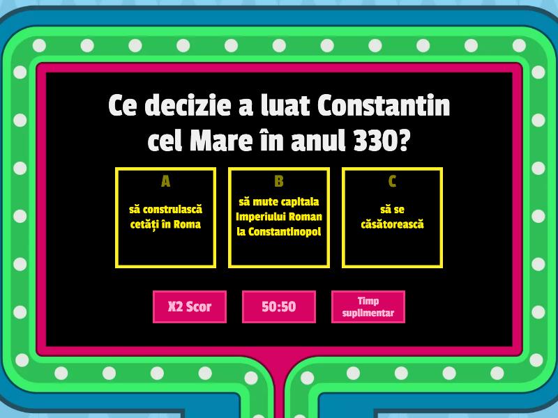 1) Ce decizie a luat Constantin cel Mare în anul 330? a) să construiască cetăți în Roma b) să mute capitala Imperiului Roman la Constantinopol c) să se căsătorească 2) Ce s-a întâmplat în anul 395 cu Imperiul Roman?  a) este cucerit de migratori b) este împărțit în Roma de Apus și Roma de Răsărit c) se dezvoltă 3) În ce an împarte Teodosie Imperiul Roman? a) 330 b) 395 c) 1453 4) Prin ce s-a remarcat împăratul Iustinian? a) prin construirea Bisericii Sfanta Sophia b) a cunoscut multe limbi străine c) prin călătorii  5) Cine a elaborat Codul de legi în Imperiul Bizantin? a) Constantin cel Mare b) Iustinian c) Teodosie 6) În ce an s-a fondat Imperiul Latin de la Constantinopol? a) 1204 b) 1445 c) 1054 7) De cine a fost cucerit Constantinopolul în anul 1453? a) maghiari b) otomani c) români