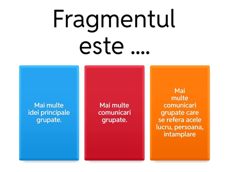 1) Fragmentul este .... a) Mai multe idei principale grupate. b) Mai multe comunicari grupate. c) Mai multe comunicari grupate care se refera acele lucru, persoana, intamplare 2) Alege substantivele care au aceeasi forma la singular si plural. a) ochi b) pui c) nume 3) Planul simplu de idei este..... a) Comunicarea prin care se transmite informatia cea mai importanta b) Textul scris pe scurt c) Ideile principale redate in ordinea din text 4) Substantivele proprii se scriu cu litera initiala mare cand..... a) Începe un enunț b) Locul substantivului este la final de propozitie c) Indiferent de locul lor în enunț 5) Care este ordinea corectă a parților unei compuneri? a) cuprins, introducere, încheiere b) introducere, încheiere, cuprins c) introducere, cuprins, incheiere