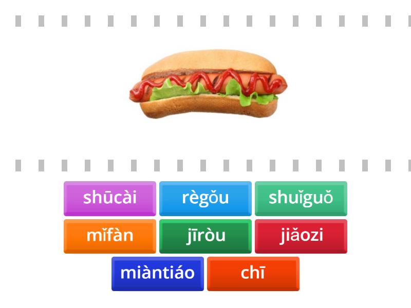 règǒu, jiǎozi, mǐfàn, jīròu, shūcài, miàntiáo, shuǐguǒ, chī,