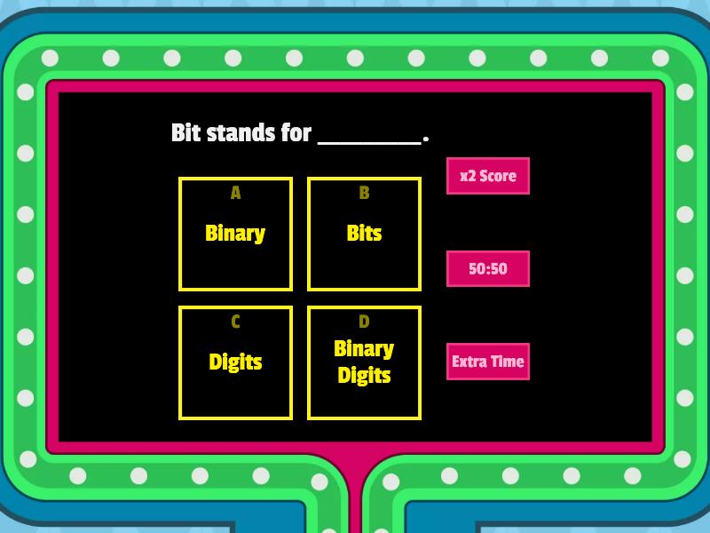 1) Bit stands for _________. a) Binary b) Bits c) Digits d) Binary Digits 2) How many bits are there in a byte? a) 2 b) 6 c) 8 d) 4 3) Which of the following represents "on" in binary? a) 0 b) 1 c) x d) on 4) If a byte has 5 bits turned on, how many bits are turned off? a) 5 b) 2 c) 3 d) 0 5) What is the largest unit of storage among these? a) GB b) MB c) TB d) KB