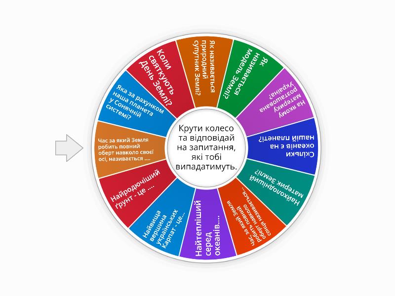 1) Яка за рахунком наша планета у Сонячній системі? 2) Коли святкують День Землі? 3) Як називається природний супутник Землі? 4) Як називається модель Землі? 5) На якому материку розташована Україна? 6) Скільки океанів є на нашій планеті? 7) Найхолодніший материк Землі? 8) Час, за який Земля робить повний оберт навколо сонця називається... 9) Найтепліший серед океанів....  10) Найвища вершина українських Карпат - це... 11) Найродючіший ґрунт - це .... 12) Час за який Земля робить повний оберт навколо своєї осі, називається ....