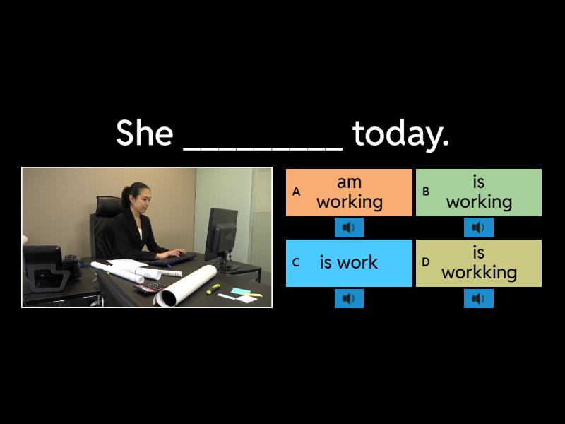 1) She _________ today. a) am working b) is working c) is work d) is workking 2) ______________ to music today. a) He's listening b) He is listen c) He listen d) He's listen 3) He __________ soccer. a) playing b) play c) is playing d) is plays 4) _________ the bed. a) She's making b) She's make c) She's doing d) She's do 5) They ________ friends right now. a) making b) are doing c) are makeing d) are making 6) He ___________ TV right now. a) is watching b) are watching c) watches d) is watch 7) _________ the dishes. a) She's doing b) She am doing c) She's making d) She make 8) I ___________ outside right now. a) am walking b) is walking c) am walk d) walking