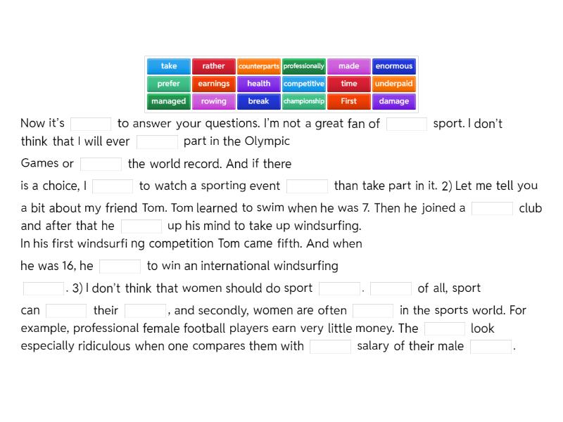 Now it’s ____ to answer your questions. I’m not a great fan of ____ sport. I don’t think that I will ever ____ part in the Olympic Games or ____ the world record. And if there is a choice, I ____ to watch a sporting event ____ than take part in it. 2) Let me tell you a bit about my friend Tom. Tom learned to swim when he was 7. Then he joined a ____ club and after that he ____ up his mind to take up windsurfing. In his first windsurfi ng competition Tom came fifth. And when he was 16, he ____ to win an international windsurfing ____. 3) I don’t think that women should do sport ____. ____ of all, sport can ____ their ____, and secondly, women are often ____ in the sports world. For example, professional female football players earn very little money. The ____ look especially ridiculous when one compares them with ____ salary of their male ____. In your email you asked me about my favourite sport. Actually, it ____ on the season. In summer, when it’s warm and sunny, I enjoy spending a lot of time outside. So, summer ____ activities ____ up all my free time. I can go ____ in the park, play badminton with some friends or swim in the lake. 5) Now I’m going to tell you a bit about sport. ____, most teenagers do sport. Some of them do their morning exercises or run in the park, others go in for a ____ sport activity: some of my friends play football or basketball. It’s ____ knowledge that doing sport helps keep ____ and stay ____. Modern teenagers ____ all ____ that sport can ____ and ____ for physical activities. 6) I believe that I’m very ____ to have a wide ____ of ____ activities at school, especially sport clubs. The school administration understands teenagers’ ____ and they work hard to ____ them. We have a swimming pool, a tennis court and a gym which is fully ____.