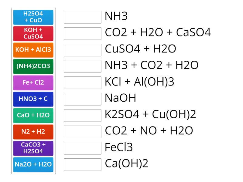 Na2O + H2O - NaOH, KOH + AlCl3 - KCl + Al(OH)3, CaO + H2O - Ca(OH)2, KOH + CuSO4 - K2SO4 + Cu(OH)2, H2SO4 + CuO - CuSO4 + H2O, CaCO3 + H2SO4 - CO2 + H2O + CaSO4, N2 + H2 - NH3, (NH4)2CO3 - NH3 + CO2 + H2O, HNO3 + C - CO2 + NO + H2O, Fe+ Cl2 - FeCl3,