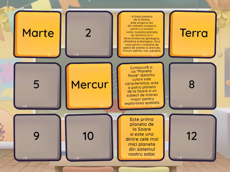 Este prima planeta de la Soare si este una dintre cele mai mici planete din sistemul nostru solar. - Mercur, A treia planeta de la Soare, este singurul loc din univers cunoscut pentru a sustine viata. Aceasta planeta se remarca prin diversitatea sa geologica, climatica si biologica, fiind casa pentru milioane de specii de plante si animale, inclusiv pentru noi, oamenii. - Terra, Cunoscută si ca "Planeta Rosie" datorita culorii sale caracteristice, este a patra planeta de la Soare si un subiect de interes major pentru explorarea spatiala. - Marte, Este cea mai mare planeta din sistemul nostru solar si al cincilea in ordinea distantei fata de Soare. - Jupiter, Este a sasea planeta de la Soare si este cunoscuta pentru sistemul sau spectaculos de inele, compus in mare parte din particule de gheata si roca. - Saturn, Este a opta si cea mai indepartata planeta de la Soare din sistemul nostru solar. - Neptun,