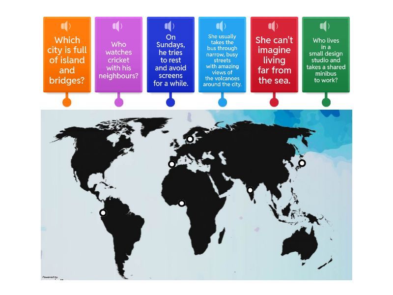 She usually takes the bus through narrow, busy streets with amazing views of the volcanoes around the city., She can't imagine living far from the sea., Which city is full of island and bridges?, Who lives in a small design studio and takes a shared minibus to work?, Who watches cricket with his neighbours?, On Sundays, he tries to rest and avoid screens for a while..