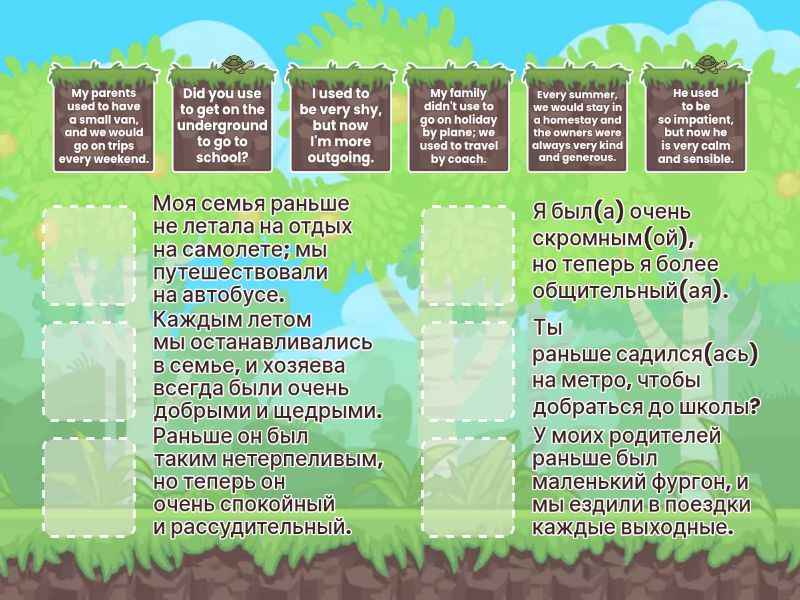 I used to be very shy, but now I'm more outgoing. - Я был(а) очень скромным(ой), но теперь я более общительный(ая)., We would often set off early in the morning to go to the campsite. - Мы часто отправлялись рано утром, чтобы поехать на кемпинг., My family didn't use to go on holiday by plane; we used to travel by coach. - Моя семья раньше не летала на отдых на самолете; мы путешествовали на автобусе., When I was a child, I would always talk to my friends while waiting in the taxi rank. - Когда я был(а) ребенком, я всегда разговаривал(а) с друзьями, пока мы ждали на стоянке такси., He used to be so impatient, but now he is very calm and sensible. - Раньше он был таким нетерпеливым, но теперь он очень спокойный и рассудительный., Did you use to get on the underground to go to school? - Ты раньше садился(ась) на метро, чтобы добраться до школы?, Every summer, we would stay in a homestay and the owners were always very kind and generous. - Каждым летом мы останавливались в семье, и хозяева всегда были очень добрыми и щедрыми., I didn't use to be a hard-working student, but now I am very determined. - Я не был(а) трудолюбивым(ой) учеником(цей), но теперь я очень целеустремленный(ая)., My parents used to have a small van, and we would go on trips every weekend. - У моих родителей раньше был маленький фургон, и мы ездили в поездки каждые выходные., What did you use to do when your flight was delayed at the airport? - Что ты делал(а), когда твой рейс задерживали в аэропорту?, She used to be very sensitive about her looks, but now she is confident and knows she is attractive. - Раньше она очень переживала из-за своей внешности, но теперь она уверена в себе и знает, что она привлекательна., Before he got his scooter, he would always skateboard to school. - До того как он получил свой скутер, он всегда катался на скейтборде в школу.,