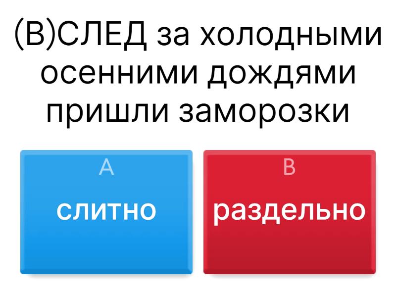 1) (в) течение дня a) раздельно b) слитно 2) (в) продолжении недели  a) слитно b) раздельно 3) (в) заключение хотелось бы сказать ... a) слитно b) раздельно 4) Приходи к нам (по)чаще! a) слитно b) раздельно 5) Я хочу узнать тебя (по)лучше. a) слитно b) раздельно 6) (выше)упомянутый пример  a) слитно b) раздельно 7) (дорого)стоящая книга a) слитно b) раздельно 8) Не представляю, что(бы) он сделал на моем месте. a) слитно b) раздельно 9) Вася позвал меня, что(бы) поговорить. a) слитно b) раздельно 10) Онегин умён, но подчёркнуто равнодушен к окружающим его людям и (ПРИ)ТОМ не видит в жизни ничего достойного своих душевных усилий. a) слитно b) раздельно 11) Жить (ЗА)СЧЁТ других Катя не могла. a) слитно b) раздельно 12) Она никогда не брала чужого, (ЗА)ТО своё готова была отдать без раздумий. a) слитно b) раздельно 13) Нужно, ЧТО(БЫ) каждая фраза выражала мысль или образ a) раздельно b) слитно 14) (НЕ)СМОТРЯ на прошедшие годы, Николай не смог простить a)  слитно b) раздельно 15) Я всё ТАК (ЖЕ) очень жалел о сказанном, хотел забыть обо всём. a) слитно b) раздельно 16) (В)СЛЕД за холодными осенними дождями пришли заморозки a) слитно b) раздельно 17) Соли можно представить (В)ВИДЕ результатов взаимодействия кислотных и основных оксидов. a) слитно b) раздельно  18) Я отправился (НА)ВСТРЕЧУ со школьными товарищами. a) слитно b) раздельно 19) (В)ВИДУ тугоплавкости и высокой химической стойкости платины из неё изготавливают лабораторную посуду. a) слитно b) раздельно