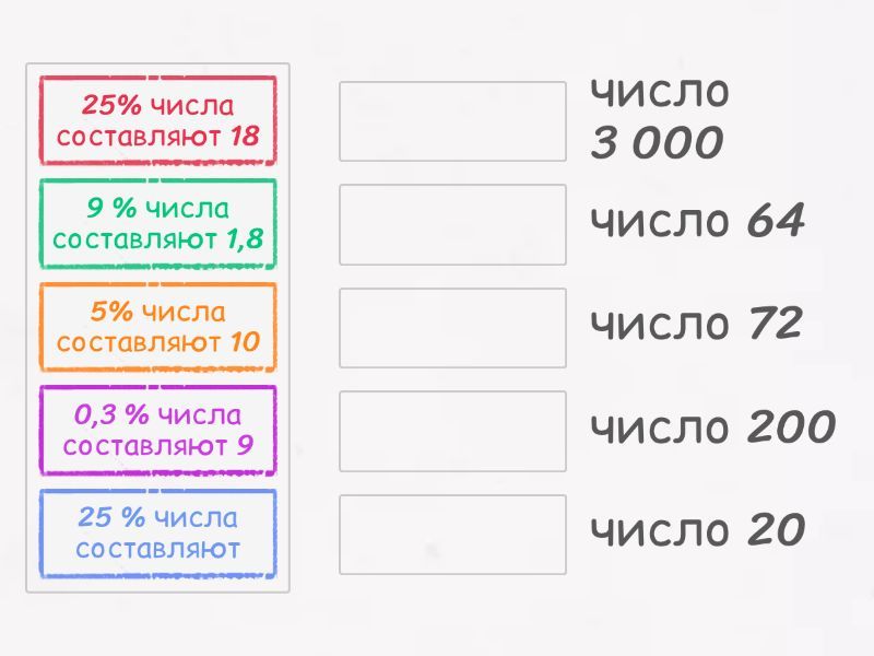 25% числа составляют 18 - число 72, 5% числа составляют 10 - число 200, 0,3 % числа составляют 9  - число 3 000, 9 % числа составляют 1,8 - число 20, 25 % числа составляют - число 64,