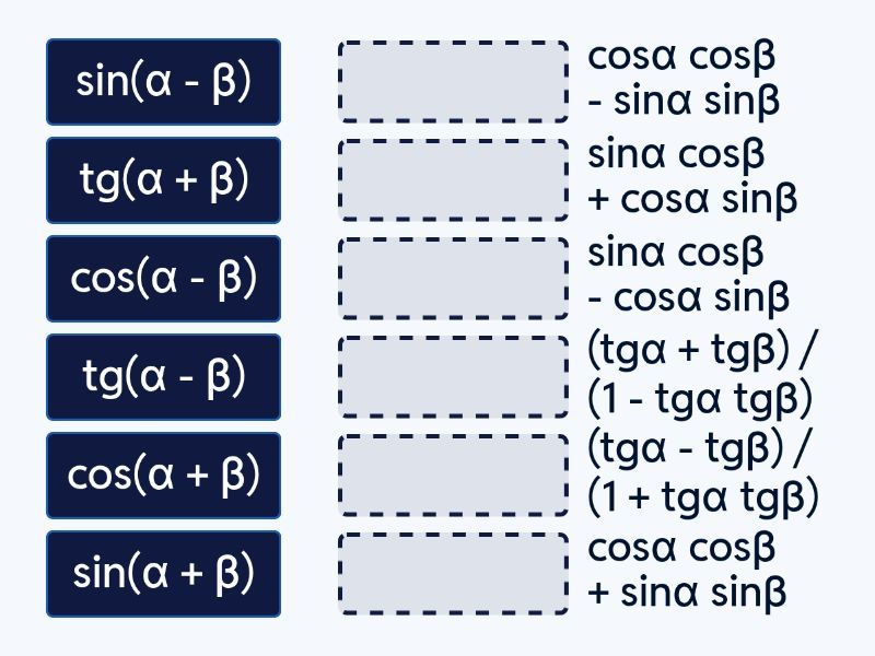 sin(α + β) - sinα cosβ + cosα sinβ, sin(α - β) - sinα cosβ - cosα sinβ, cos(α + β) - cosα cosβ - sinα sinβ, cos(α - β) - cosα cosβ + sinα sinβ, tg(α + β) - (tgα + tgβ) / (1 - tgα tgβ), tg(α - β) - (tgα - tgβ) / (1 + tgα tgβ),