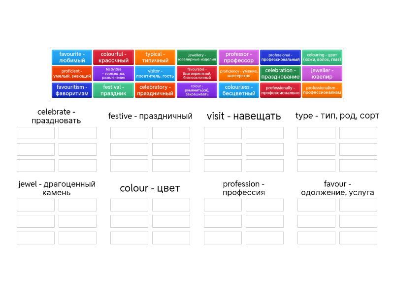 celebrate - праздновать: celebration - празднование, celebratory - праздничный, festive - праздничный: festival - праздник, festivities - торжества, развлечения, visit - навещать: visitor - посетитель, гость, type - тип, род, сорт: typical - типичный, jewel - драгоценный камень: jeweller - ювелир, jewellery - ювелирные изделия, colour - цвет: colour - румянить(ся), закрашивать, colourful - красочный, colouring - цвет (кожи, волос, глаз), colourless - бесцветный, profession - профессия: professional - профессиональный, professionalism - профессионализм , professionally - профессионально, professor - профессор, proficiency - умение, мастерство, proficient - умелый, знающий, favour - одолжение, услуга: favourable - благоприятный, благосклонный, favourite - любимый, favouritism - фаворитизм,