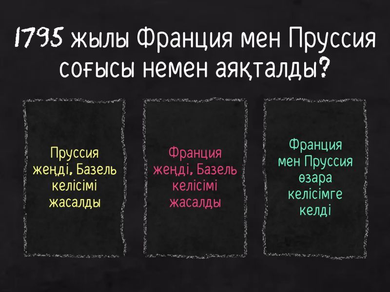 1) 1795 жылы Франция мен Пруссия соғысы немен аяқталды? a) Пруссия жеңді, Базель келісімі жасалды b) Франция жеңді, Базель келісімі жасалды c) Франция мен Пруссия өзара келісімге келді 2) Н.Бонапарт бастаған француз әскері Италияға қай жылы басып кірді? a) 1794жылы b) 1795жылы c) 1796жылы d) 1797жылы 3) 1799 жылы 18 брюмер төңкерісі немен аяқталды және билікке кімдер келді? a) Директория жойылып, билікке монархия келді b) Директория жойылып, билікке 3 консул келді c) Директория жойылып, билікке Ұлттық Конвент келді d) Директория жойылып, билікке Н.Бонапарт император ретінде келді 4) Қай жылы Н.Бонапарт "француз императоры" болып жарияланды? Францияда Бірінші империя құрылды a) 1804 жылы b) 1805 жылы c) 1806 жылы d) 1807 жылы 5) "Наполеон кодекстері" қабылданған соң Франция экономикасы қалай өзгерді? a) Дамыды: ауылшаруашылығы табысты дамыды, Француз банкі құрылды, Өнеркәсіп төңкерісі қарқынды жүрді b) Құлдырады: ауылшаруашылығы мен өнеркәсіп тежелді 6) Наполеон билік құрған жылдар: a) 1790-1815жж b) 1790-1820жж c) 1799-1820жж d) 1799-1815жж 7) Францияға қарсы одақ құрған негізгі мемлекеттер: a) Англия, Ресей, Пруссия, Бельгия b) Англия, Ресей, Пруссия, Австрия c) Англия, Испания, Пруссия, Австрия d) Италия, Ресей, Пруссия, Австрия 8) 1805 жылы адмирал Нельсон басқарған қандай ірі теңіз шайқасы өтті? a) Трафальгар шайқасы b) Лейпциг шайқасы c) Бородино шайқасы 9) Наполеонның испан халқымен күресі қай жылдарды қамтыды? a) 1807-1813жж b) 1808-1813жж c) 1808-1815жж 10) Наполеонның Ресейге жорығы қашан басталды? a) 1811 жылы 24 маусымда b) 1812 жылы 24 маусымда c) 1813 жылы 24 маусымда d) 1814 жылы 24 маусымда 11) Франция мен Ресей соғысының нәтижесі: a) Француз әскері Мәскеуге кіріп, француздар жеңеді b) Француз әскері Мәскеуге кіреді, бірақ жеңіліске ұшырайды 12) 1813 жылы Лейпциг түбінде "Халықтар соғысы" немен аяқталады? a) Француздар жеңіп, Наполеон империясы күшейеді b) Француздар жеңіліп, 1814жылы Наполеон тақтан бас тартады c) Француздар жеңеді, бірақ 1814жылы Наполеон тақтан бас тартады 13) Наполеон қамалған Эльба аралынан қашып, қай жылы билікке қайта келеді? a) 1814 ж b) 1815 ж c) 1816 ж d) 1818 ж 14) Ватерлоо түбіндегі шайқас нәтижесі: a) 1815 жылы Наполеон жеңіледі b) 1815 жылы Наполеон жеңеді c) 1815 жылы Наполеон ортақ келісімге келеді
