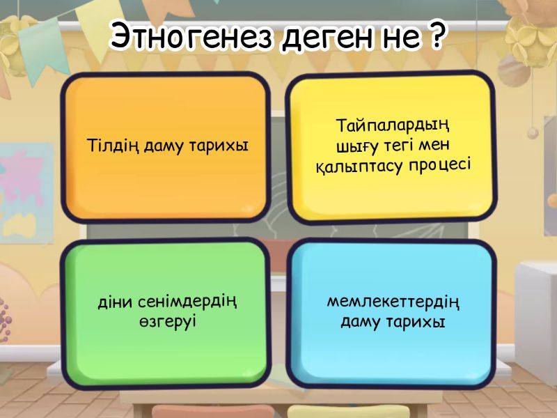 1) Этногенез деген не ? a) Тілдің даму тарихы b) Тайпалардың шығу тегі мен қалыптасу процесі c) діни сенімдердің өзгеруі d) мемлекеттердің даму тарихы 2) Моңғол шапқыншылығы қандай процесті күшейтті ? a) Орталық Азия тайпаларының батысқа ығысуын b) Русьтің шығысқа жорығын c) Түркі тайпаларының шығысқа көшуі d) Қыпшақтардың татарларға сіңуі 3) Этномәдени үрдістердің маңызды элементі ? a) Сауда жолдарын кеңейту b) жаңа қала салу c) Тайпалардың араласуы d) мәдени ескерткіштер салу 4) Алтын орда қай ұлыстың негізінде құрылды ? a) Шағатай b) Үгедей c) Қарақытай d) Жошы 5) Жошы ұлысының көшпелілері қалай аталды? a) Қазақтар b) Моңғолдар c) татарлар d) түркілер 6) 1312-1342 ж билік еткен хан a) Өзбек b) Әбілқайыр c) Жошы d) Үгедей 7) Алтын Орданың негізін қалаушысы a) Берке хан b) Бату хан c) Жошы хан d) Шағатай 8) Ұлы Дүрбелең кезеңі a) 1456-1465ж b) 1312-1342ж c) 1357-1380ж d) 1227-1255 9) Қазақ сөзінің мағынасы a) Батыр, ержүрек жауынгер b) Еркін, азат адам c) көшпелі тайпа басшысы d) мейрімді, жаужүрек 10) Қазақ этногенезі қай кезеңде аяқталды ? a) Қазақ хандығы құрылғанда b) моңғол шапқыншылығы кезінде c) Жошы ұлысы құрылғанда d) Ақ орда мен көк орда біріккен кезде 11) Мауереннахарға кеткен көшпенділерді кейін қалай аталды ? a) Қырғыздар b) Өзбектер c) Қазақтар d) Ноғайлар 12) Өтемістің ұлдарының қайсысы Жошы Ұлысын Құрды ? a) Шағатай b) үгедей c) Бату d) Құбылай 13) Өзбек хандығы қай тайпалар негізінде қалыптасты? a) Қыпшақ және түркі тайпалары b) найман, керей c) моғолдар d) қарлұқ пен оғыздар 14) Бонус a) 1 шыққан топқа +300балл b) 2 шыккан топка +100балл 15) Қазақстан аумағы толықтай Моңғол империясының құрамына өтті a) 1224-1225 ж b) 1218- 1219ж c) 1219 - 1221ж d) 1227- 1255 ж