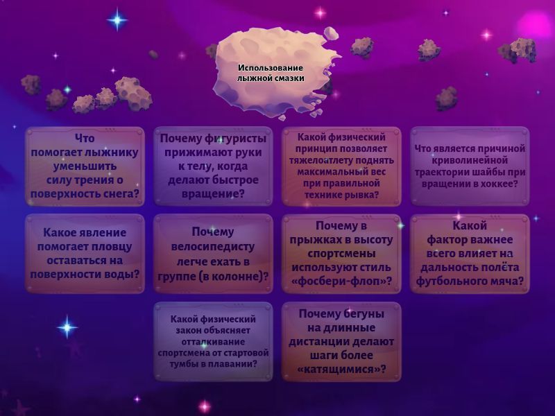 Что помогает лыжнику уменьшить силу трения о поверхность снега? - Использование лыжной смазки, Какой физический закон объясняет отталкивание спортсмена от стартовой тумбы в плавании? - Третий закон Ньютона, Почему бегуны на длинные дистанции делают шаги более «катящимися»? - Чтобы уменьшить трение и сохранить энергию, Какой фактор важнее всего влияет на дальность полёта футбольного мяча? - Угол броска/удара, Почему фигуристы прижимают руки к телу, когда делают быстрое вращение? - Чтобы уменьшить момент инерции и увеличить скорость вращения, Какое явление помогает пловцу оставаться на поверхности воды? - Архимедова сила, Почему в прыжках в высоту спортсмены используют стиль «фосбери-флоп»? - Центр масс тела проходит ниже планки, облегчая прыжок, Что является причиной криволинейной траектории шайбы при вращении в хоккее? - Эффект Магнуса, Почему велосипедисту легче ехать в группе (в колонне)? - Уменьшается аэродинамическое сопротивление, Какой физический принцип позволяет тяжелоатлету поднять максимальный вес при правильной технике рывка? - Принцип сохранения импульса и оптимального распределения моментов,
