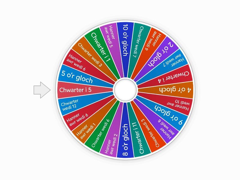 1) 5 o'r gloch 2) Hanner awr wedi 6 3) Chwarter wedi 3 4) Chwarter i 1 5) Hanner awr wedi 5 6) 10 o'r gloch 7) Chwarter wedi 7 8) Hanner awr wedi 9 9) 2 o'r gloch 10) Hanner awr wedi 7 11) Chwarter i 4 12) 4 o'r gloch 13) Hanner awr wedi 10 14) 9 o'r gloch 15) Hanner awr wedi 8 16) Chwarter wedi 3 17) Chwarter i 11 18) 8 o'r gloch 19) Hanner awr wedi 2 20) Chwarter wedi 6 21) Hanner awr wedi 1 22) Hanner awr wedi 6 23) Chwarter wedi 12 24) Chwarter i 5
