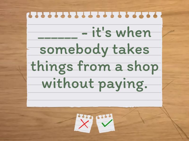 ____ steals money from a bank. - Robber steals money from a bank., Burglar ______ ____ _____ and takes things from it. - Burglar breaks into a house and takes things from it., Vandalism - it's when somebody ______ public property. - Vandalism - it's when somebody damages public property., Murderer _____ another person. - Murderer kills another person., ______ - it's when somebody takes things from a shop without paying. - Shoplifting - it's when somebody takes things from a shop without paying., _______ does something illegal on the Internet or using a computer. - Haker/Cybercriminal does something illegal on the Internet or using a computer., Mugging - it's when somebody takes a person's money or possessions using _______. - Mugging - it's when somebody takes a person's money or possessions using violence., _____ - it's when somebody takes a person away illegally and asks for money - Kidnapping - it's when somebody takes a person away illegally and asks for money., _____- takes something or somebody secretly or illegally into or out of a place. - Smuggler takes something or somebody secretly or illegally into or out of a place., ______ - it's when somebody burns a building or place deliberately. - Arson - it's when somebody burns a building or place deliberately.,
