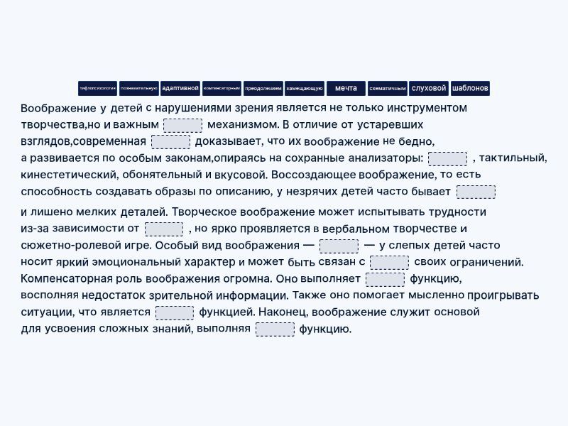 Воображение у детей с нарушениями зрения является не только инструментом творчества,но и важным ____ механизмом. В отличие от устаревших взглядов,современная ____ доказывает, что их воображение не бедно, а развивается по особым законам,опираясь на сохранные анализаторы: ____ , тактильный, кинестетический, обонятельный и вкусовой. Воссоздающее воображение, то есть способность создавать образы по описанию, у незрячих детей часто бывает ____ и лишено мелких деталей. Творческое воображение может испытывать трудности из-за зависимости от ____ , но ярко проявляется в вербальном творчестве и сюжетно-ролевой игре. Особый вид воображения — ____ — у слепых детей часто носит яркий эмоциональный характер и может быть связан с ____ своих ограничений. Компенсаторная роль воображения огромна. Оно выполняет ____ функцию, восполняя недостаток зрительной информации. Также оно помогает мысленно проигрывать ситуации, что является ____ функцией. Наконец, воображение служит основой для усвоения сложных знаний, выполняя ____ функцию.