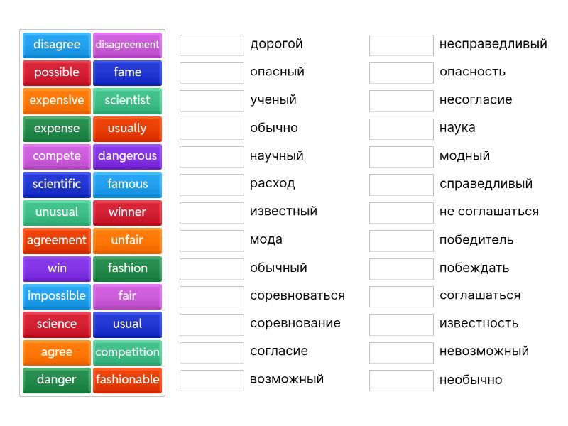competition - соревнование, compete - соревноваться, fame - известность, famous - известный, win - побеждать, winner - победитель, fashion - мода, fashionable - модный, expense - расход, expensive - дорогой, fair - справедливый, unfair - несправедливый, danger - опасность, dangerous - опасный, science - наука, scientific - научный, scientist - ученый, usual - обычный, usually - обычно, unusual - необычно, agreement - согласие, agree - соглашаться, disagreement - несогласие, disagree - не соглашаться, possible - возможный, impossible - невозможный,