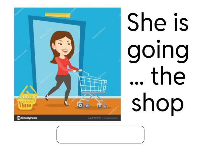 The train is going ... the tunnel, They are going ... the river, The man in black is getting ... his car, The child is going ... the slide, The woman is getting ... the taxi , She is putting the pyramyd ... the blocks, She is putting bread ... the cart, They are climbing ... the mountain, The horse is jumping ... the river, The are going ... the road, The rocket is flying ... the planet, He fell ... the bike, The woman is going ... the stairs, the dog is jumping ... the circle, The man is jumping ... the bus, The bear is going ... the hole, She is putting the cherry ... the cake, She is going ... the shop.