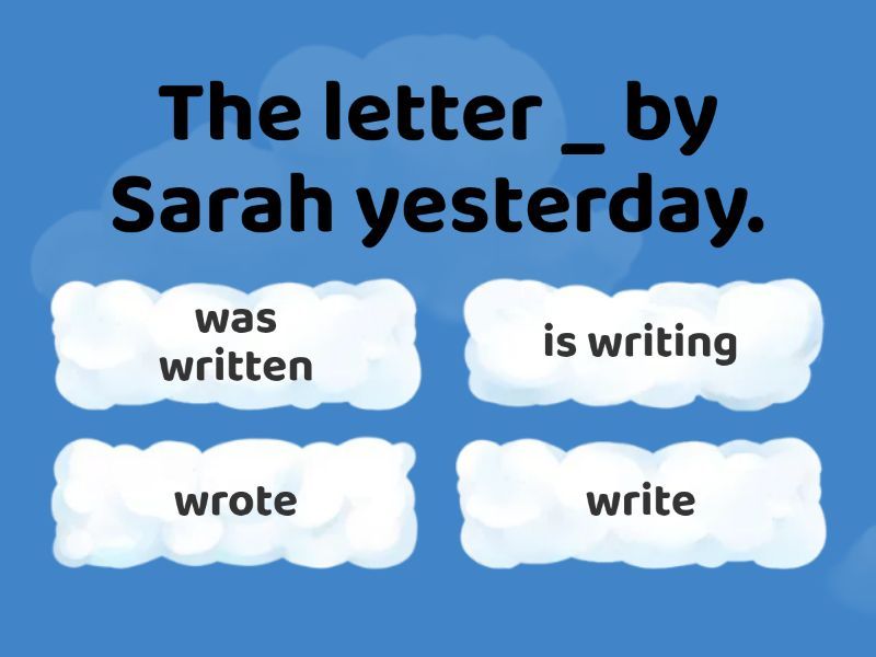 1) The letter _ by Sarah yesterday. a) was written b) is writing c) wrote d) write 2) The pictures _ by the artist last year. a) are painted b) painting c) were painted d) paint 3) The flowers _ every week by my grandmother. a) watered b) are watered c) watering d) was watered 4) The game _ by the team next Saturday. a) played b) will be played c) is playing d) plays