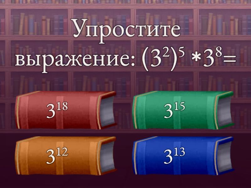 1) Упростите выражение: (32)5 ∗38= a) 318 b) 315 c) 312 d) 313 2) Упростите выражение: t5 ∗ (t3)2= a) t11 b) t12 c) t7 d) t10 3) Найдите значение выражения: (-2)3∗(-2)2= a) 32 b) -32 c) 16 d) -16 4) Найдите значение выражения: 2∗57:54= a) 125 b) 50 c) 250 d) 100 5) Найдите значение выражения: (-5)6:(-5)4= a) -25 b) 5 c) -5 d) 25 6) Представьте степень в виде произведения степеней: (3x)4  a) 27x b) 81x4 c) 81x d) 27x4 7) Представьте в виде степени с основанием a выражение: ((a6)2)3 a) a12 b) a15 c) a11 d) a36 8) Вычислить: (512∗54) ∕ 513= a) 25 b) 125 c) 5 d) 1 9) Вычислить: 75∗77:79= a) 49 b) 147 c) 343 d) 21 10) Представьте в виде степени с основанием ac выражение: (2ac)4= a) 16a4c4 b) 16ac c) 8a4c4 d) 8ac