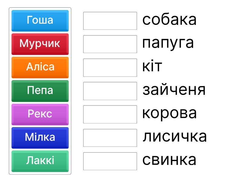 Мурчик - кіт, Рекс - собака, Гоша - папуга, Мілка - корова, Квітка - коза, Пепа - свинка, Філя - хом'як, Афіна - сова, Сніжок - цап, Лаккі - зайченя , Тедді - ведмедик, Акела - вовк, Аліса - лисичка,