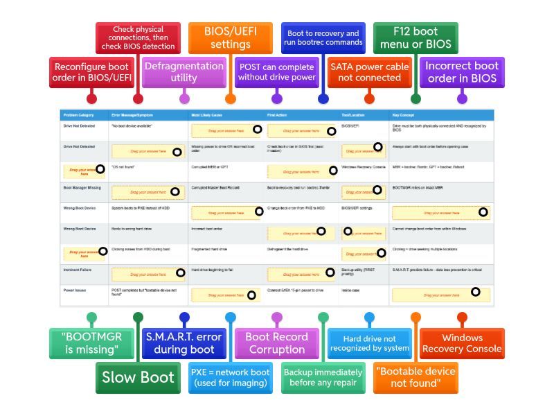 Hard drive not recognized by system, Check physical connections, then check BIOS detection, "Bootable device not found", F12 boot menu or BIOS, Boot Record Corruption, Boot to recovery and run bootrec commands, "BOOTMGR is missing", Windows Recovery Console, Incorrect boot order in BIOS, PXE = network boot (used for imaging), Reconfigure boot order in BIOS/UEFI, BIOS/UEFI settings, Slow Boot, Defragmentation utility, S.M.A.R.T. error during boot, Backup immediately before any repair, SATA power cable not connected, POST can complete without drive power.