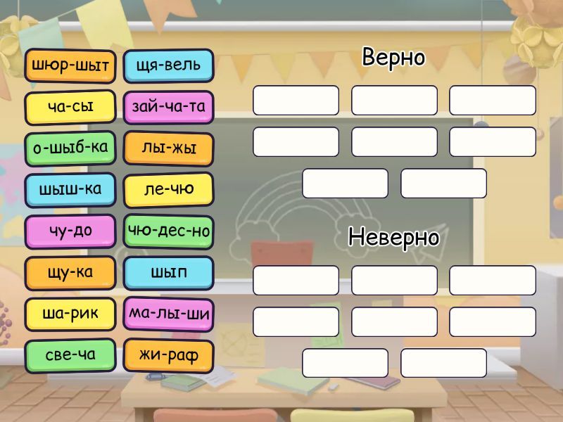 Верно: щу-ка, чу-до, ша-рик, све-ча, зай-ча-та, жи-раф, ма-лы-ши, ча-сы, Неверно: чю-дес-но, шюр-шыт, щя-вель, шып, ле-чю, шыш-ка, о-шыб-ка, лы-жы,