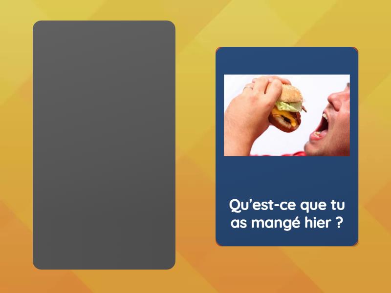 Est-ce que tu as passé l’aspirateur hier ?, Qu’est-ce que tu as mangé hier ? , Est-ce que tu as joué aux cartes hier ?, Est-ce que tu as écouté de la musique hier ?, Est-ce que tu as dansé hier ?, Est-ce que tu as joué au football le week-end dernier ? , Quand est-ce que tu as déménagé ?, Est-ce que tu as envoyé un message hier ?, Est-ce que tu as conduit hier ? Est-ce que tu as pris la voiture hier ? , Est-ce que tu as pris le métro ce matin ? À quelle heure tu as pris le métro ce matin ?, Est-ce que tu as fait les courses hier ? Où tu as fait les courses hier ?, Est-ce que tu as fait la vaisselle hier ? Qui a fait la vaisselle chez toi hier ?, Est-ce que tu as bien dormi hier ? Combien d’heures tu as dormi cette nuit ?, Est-ce que tu as couru hier ?, Est-ce que tu as bu du jus d’orange hier ?, Est-ce que tu as lu un livre hier ?, Est-ce que tu as déjà perdu tes clés ? .