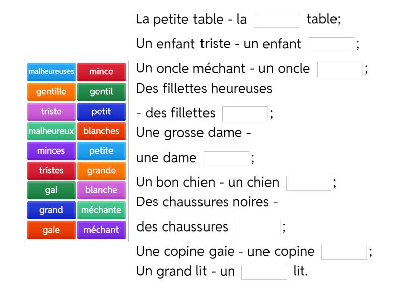 La petite table - la ____ table; Un enfant triste - un enfant ____; Un oncle méchant - un oncle ____; Des fillettes heureuses - des fillettes ____; Une grosse dame - une dame ____; Un bon chien - un chien ____; Des chaussures noires - des chaussures ____; Une copine gaie - une copine ____; Un grand lit - un ____ lit.
