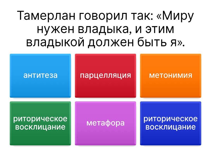 1) (2)Почему надо? (3)А потому. (4)Вот так принято. (5)Иначе накажут, или выгонят, или будут презирать… a) вопросно-ответная форма изложения b) парцелляция c) антитеза d) градация 2) (11)Большинство всегда и не хотело (и не могло) думать и решать самостоятельно. (12)Но некоторые умственно непоседливые всегда хотели докопаться до всех первопричин сами… a) противопоставление b) парцелляция c) градация d) риторический вопрос 3) Тамерлан говорил так: «Миру нужен владыка, и этим владыкой должен быть я». a) антитеза b) парцелляция c) метонимия d) риторическое восклицание e) метафора f) риторическое восклицание 4) Время никогда не бывает пустым. a) градация b) метафора c) антитеза  d) риторическое восклицание  5) (14)Почему не получается? (15)Попробуйте спросить у хорошего скрипача, месяцами не бравшего скрипку в руки, почему не выходит у него знакомый пассаж. (16)Да потому, что не было ежедневной тренировки пальцев, не было необходимой практики. a) градация b) метафора c) антитеза  d) риторическое восклицание  e) вопросно-ответная форма изложения f) риторический вопрос 6) 33)Много я видел преданных собак, собак покорных, строптивых, гордецов, стоиков, подлиз, равнодушных, лукавых и пустых. a) эпитет b) сравнение c) вопросно-ответная форма изложения d) эпифора e) литота 7) Он любил его страстно и поэтично, может быть, больше жизни. a)  литота b) вопросно-ответная форма изложения c) сравнение d) эпифора e) ряды однородных членов