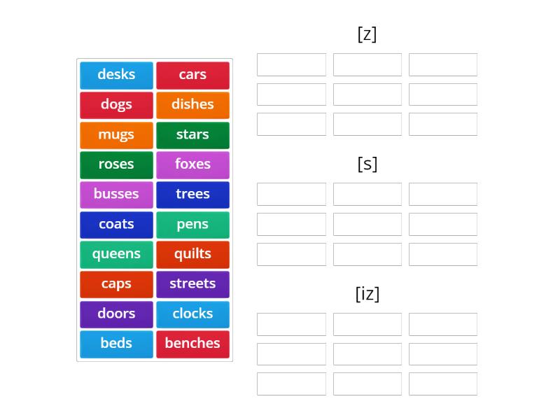 [z]: pens, beds, dogs, queens, trees, stars, doors, cars, mugs, [s]: caps, clocks, streets, quilts, desks, coats, [iz]: foxes, benches, busses, roses, dishes,