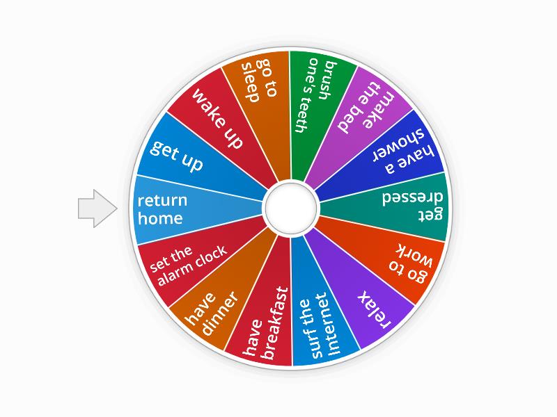 1) get up 2) wake up 3) go to sleep 4) brush one's teeth 5) make the bed 6) have a shower 7) get dressed 8) go to work 9) relax 10) surf the Internet 11) have breakfast 12) have dinner 13) set the alarm clock 14) return home