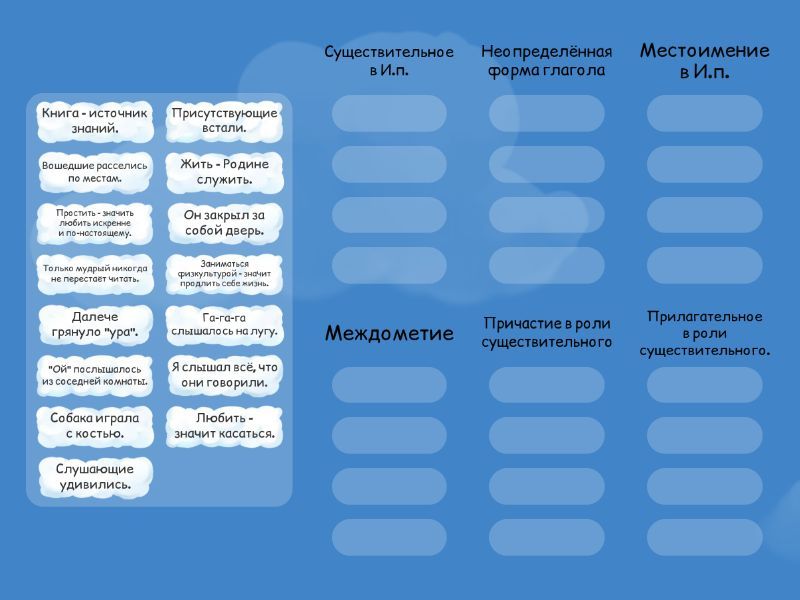 Существительное в И.п.: Собака играла с костью., Книга - источник знаний., Неопределённая форма глагола: Жить - Родине служить., Любить - значит касаться., Простить - значить любить искренне и по-настоящему., Заниматься физкультурой - значит продлить себе жизнь. , Местоимение в И.п.: Я слышал всё, что они говорили., Он закрыл за собой дверь., Междометие: Га-га-га слышалось на лугу., Далече грянуло "ура"., "Ой" послышалось из соседней комнаты., Причастие в роли существительного: Присутствующие встали., Вошедшие расселись по местам. , Слушающие удивились. , Прилагательное в роли существительного. : Только мудрый никогда не перестаёт читать. ,