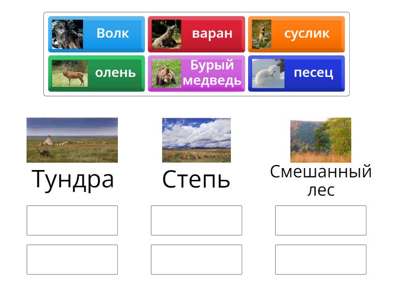 Тундра: песец, олень, Степь: варан, суслик, Смешанный лес: Волк, Бурый медведь,