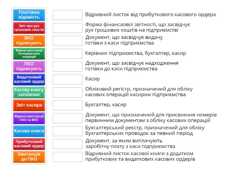 Прибутковий касовий ордер - Документ, що засвідчує надходження готівки до каси підприємства, Видатковий касовий ордер - Документ, що засвідчує видачу готівки з каси підприємства, Касова книга - Обліковий регістр, призначений для обліку касових операцій касиром підприємства, Звіт касира - Відривний листок касової книги з додатком прибуткових та видаткових касових ордерів, Журнал реєстрації ПКО та ВКО - Документ, що призначений для присвоєння номерів первинним документам з обліку касових операцій, Журнал реєстрації господарських операцій - Бухгалтерський реєстр, призначений для обліку бухгалтерських проводок за певний період, Платіжна відомість - Документ, за яким виплачують заробітну плату з каси підприємства, Квитанція до ПКО - Відривний листок від прибуткового касового ордера, Звіт про рух грошових коштів - Форма фінансаової звітності, що засвідчує рух грошових коштів на підприємстві, ПКО підписують - Бухгалтер, касир, ВКО підписують - Керівник підприємства, бухгалтер, касир, Касову книгу заповнює - Касир,